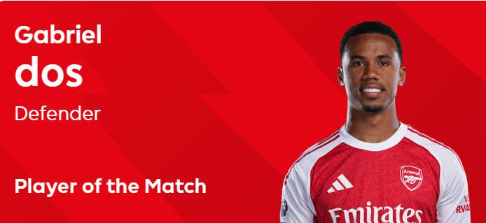 献制胜助攻,加布里埃尔当选富勒姆vs阿森纳球迷票选最佳球员